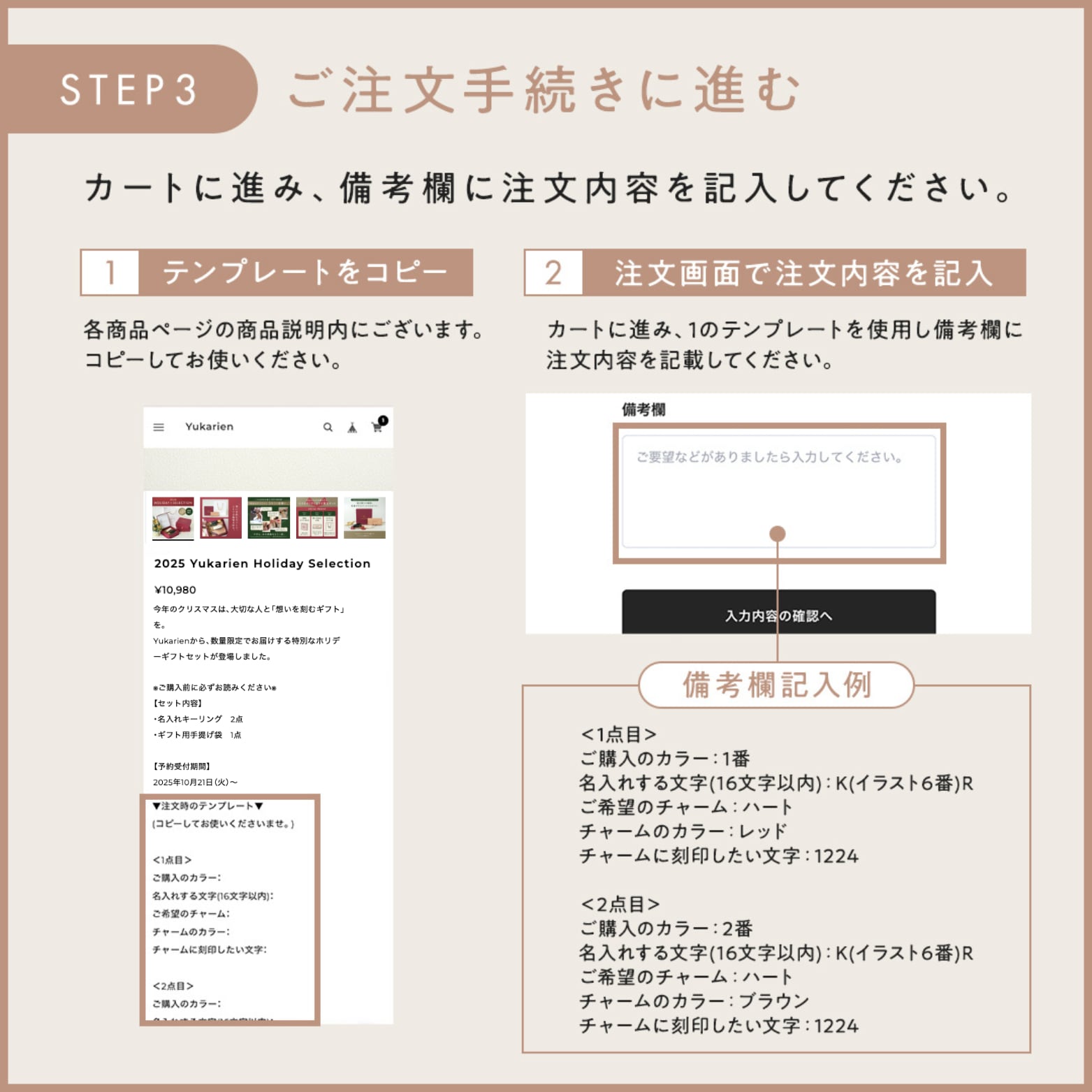 商品をご購入後、「備考欄」に下記テンプレートをお送りください。